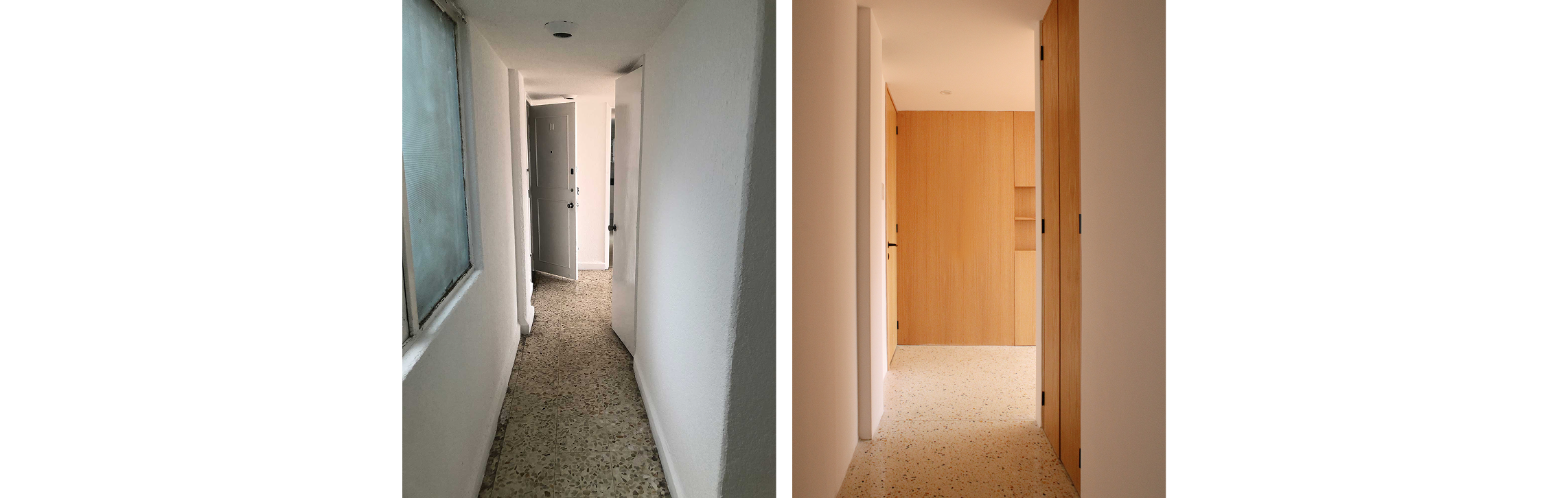 El elemento central del espacio es un cubo de carpintería ubicado a la entrada del departamento, que funciona como vestíbulo y articula la cocina, la sala y el pasillo hacia las habitaciones. Este volumen alberga discretamente un cuarto de servicios y una alacena, permitiendo una organización eficiente y eliminando elementos visuales que distraen, para lograr una cocina plenamente abierta, limpia y armoniosa.